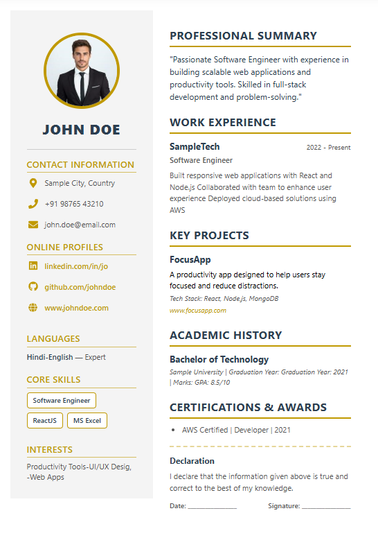 Build a professional resume in minutes with LevoTools' free Resume Builder. No signup required — choose from available ATS-friendly templates, upload a profile photo (on supported templates), preview live, and export as print-ready PDF or editable DOCX.